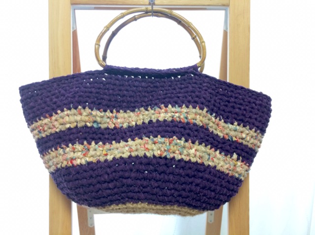 落ち着いたパープル色に合わせて2本のラインがアクセントのかごバッグです。 コットン、リネン、バンブーと、3種類の天然素材から出来た少し大きめサイズのかごバッグはお買い物はもちろん、旅先でも重宝しそうですね。 サイズ 底径 30cm 高さ 19cm