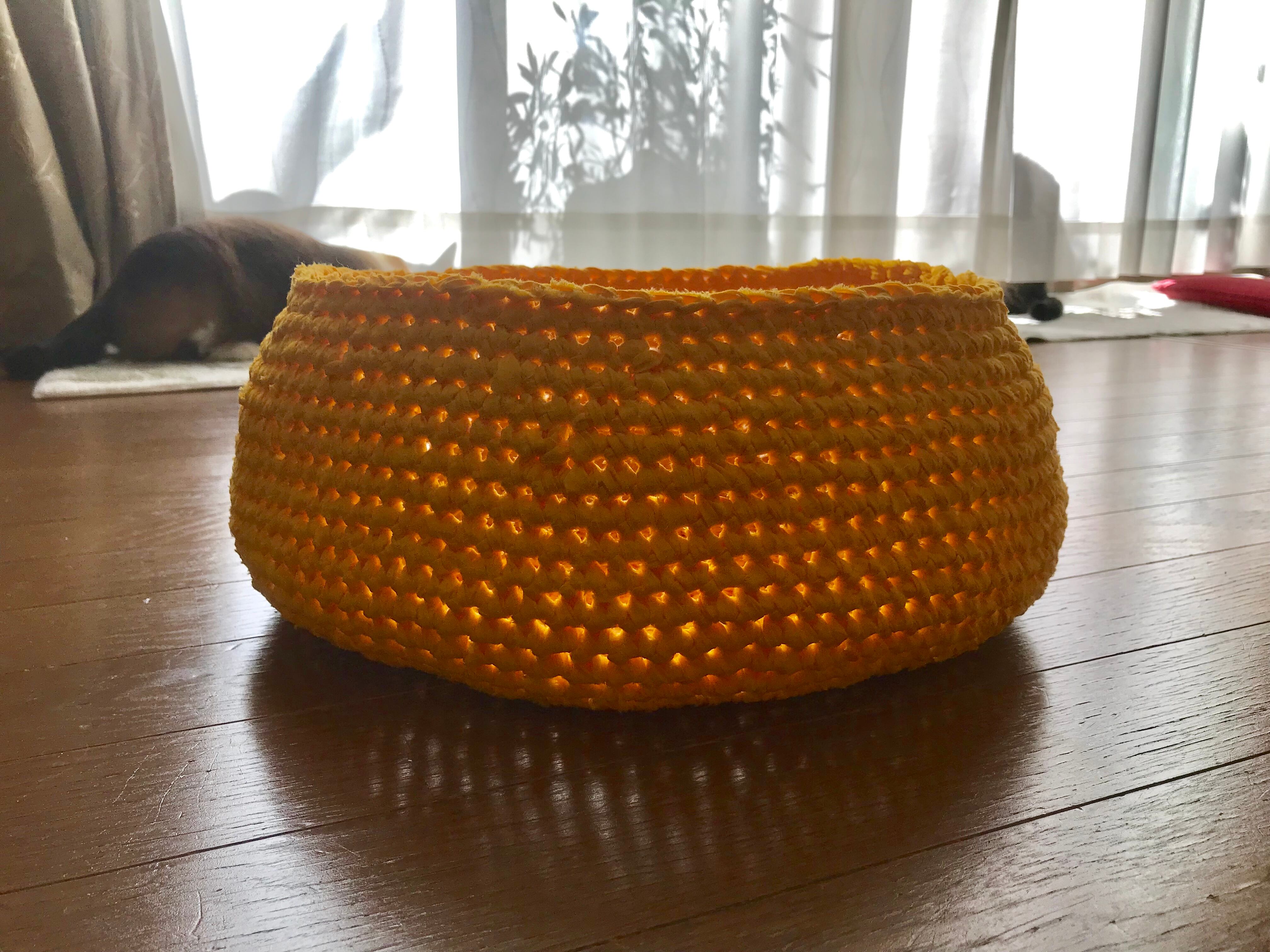 コットン100%の生地を裂いて糸を作り丁寧に編んだ猫用のかごが編み上がりました。